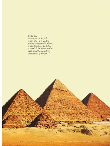 พีระมิดกีซา สิ่งก่อสร้างขนาดมหึมานี้เป็น ข้อพิสูจน์ถึงความปราดเปรื่อง ด้านวิทยาการของชาวอียิปต์โบราณ พีระมิดที่เห็นคือมหาพีระมิดกีซา (Giza) ซึ่งเป็นสิ่งมหัศจรรย์ของโลก สมัยโบราณที่ยังคงหลงเหลืออยู่ เพียงแห่งเดียว (ดูหน้า 38) บทนำา g 7