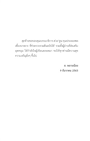 สุดท้ายขอขอบคุณบรรณาธิการ ต่วย’ตูน คุณประลองพล ี ี เพ้ยงบางยาง ท่ช่วยรวบรวมต้นฉบับให้ รวมท้งผู้อ่านท่ส่งเสริม ี ั � อุดหนุน ให้กาลังใจผู้เขียนตลอดมา ขอให้ทุกท่านมีความสุข ความเจริญย่งๆ ข้นไป ิ ึ ส. พลายน้อย 9 ธันวาคม 2563