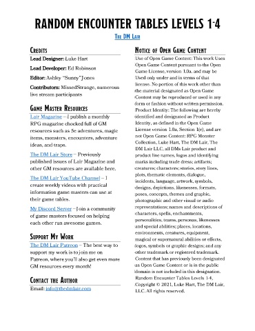 - RANDOM ENCOUNTER TABLES LEVELS 14 The DM Lair Credits Notice of Open Game Content Game Master Resources Support My Work Contact the Author