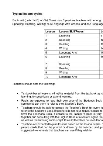 Each unit (units 1–10) of Get Smart plus 3 provides teachers with enough materials for 16 lessons, including three cycles of the four skills (Listening,