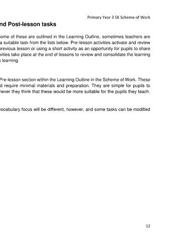 Each lesson includes a suggestion for Pre-lesson and Post-lesson tasks. Some of these are outlined in the Learning Outline, sometimes teachers are