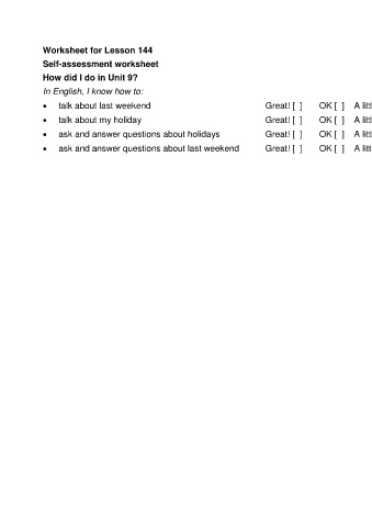ask and answer questions about last weekend Great! [ ] OK [ ] A little [ ]