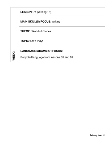 LESSON: 74 (Writing 15) MAIN SKILL(S) FOCUS: Writing THEME: World of Stories WEEK: _______________ TOPIC: Let’s Play! LANGUAGE/GRAMMAR FOCUS: Recycled language from lessons 68 and 69 179 Primary Year 1 Scheme of Work
