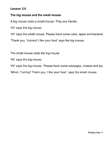 ‘Thank you. Yummy! I like your food’ says the big mouse.