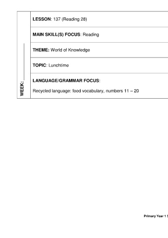 LESSON: 137 (Reading 28) MAIN SKILL(S) FOCUS: Reading THEME: World of Knowledge WEEK: _______________ TOPIC: Lunchtime LANGUAGE/GRAMMAR FOCUS: Recycled language: food vocabulary, numbers 11 – 20 317 Primary Year 1 Scheme of Work