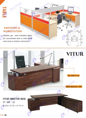 TABLE PARTITION & WORKSTATION Whether you need individual offices for concentrated work or team-based work areas to enhance interaction. VITUR Top tabel 4 cm Table Material : HPL VITUR DIRECTOR DESK VT. DIR - 22 W 242 x D 210 x H 75 cm 46