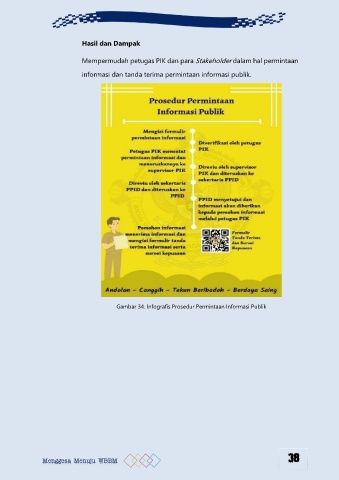 Hasil dan Dampak Mempermudah petugas PIK dan para Stakeholder dalam hal permintaan informasi dan tanda terima permintaan informasi publik. Gambar 34. Infografis Prosedur Permintaan Informasi Publik 38 Menggesa Menuju WBBM