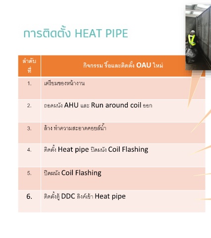 ล ำดับ กิจกรรม ร้อและติดตั้ง OAU ใหม ่ ื ที ่ ี ้ 1. เตรยมของหนางาน 2. ถอดผนัง AHU และ Run around coil ออก ์ ้ 3. ลาง ท าความสะอาดคอยลน้า ิ 4. ติดตั้ง Heat pipe ปดผนัง Coil Flashing ิ 5. ปดผนัง Coil Flashing ้ ์ ้ 6. ติดตั้งตู DDC ลิงคเขา Heat pipe