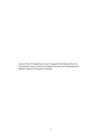 Laporan Projek Prototaip Bagi Laman E-Dagang Produk Rempah Ratus ini dikemukakan sebagai memenuhi sebahagian daripada syarat penganugerahan Diploma Pengajian Perniagaan (E-Dagang). iv
