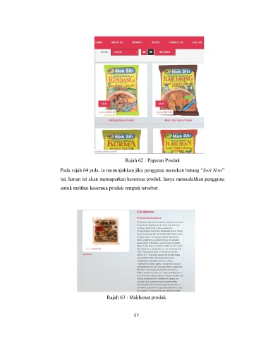 Rajah 62 : Paparan Produk Pada rajah 64 pula, ia menunjukkan jika pengguna menekan butang “Sort Now” ini, laman ini akan memaparkan kesemua produk. Ianya memudahkan pengguna untuk melihat kesemua produk rempah tersebut. Rajah 63 : Maklumat produk 57