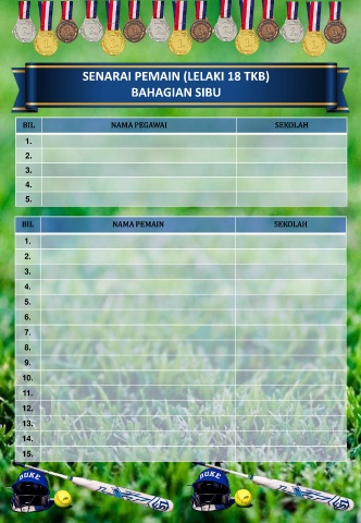 SENARAI PEMAIN (LELAKI 18 TKB) BAHAGIAN SIBU BIL NAMA PEGAWAI SEKOLAH 1. 2. 3. 4. 5. BIL NAMA PEMAIN SEKOLAH 1. 2. 3. 4. 5. 6. 7. 8. 9. 10. 11. 12. 13. 14. 15.