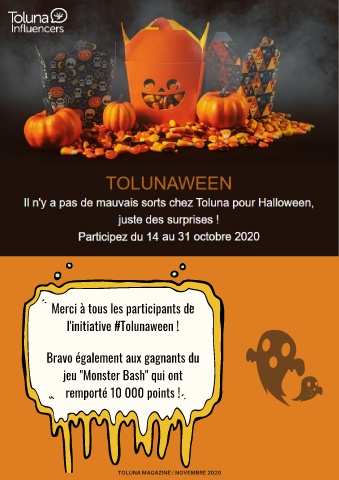 Merci à tous les participants de l'initiative #Tolunaween ! Bravo également aux gagnants du jeu "Monster Bash" qui ont remporté 10 000 points ! TOLUNA MAGAZINE / NOVEMBRE 2020