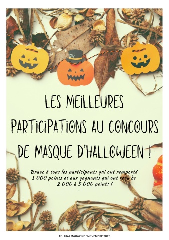 les meilleures participations au concours de masque d'halloween ! Bravo à tous les participants qui ont remporté 1 000 points et aux gagnants qui ont reçu de 2 000 à 5 000 points ! TOLUNA MAGAZINE / NOVEMBRE 2020