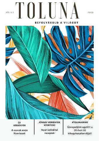J Ú L I U S TOLUNA 2 0 2 0 B E F O L Y Á S O L D A V I L Á G O T ŰJ JŰNIUSI VERSENYEK #TOLUNAWINS VERSENYEK NYERTESEI Ünnepeljünk együtt! a A szavak ereje Nyári üdítőital 20 évet 20 Nyertesek receptek kihagyhatatlan díjjal!