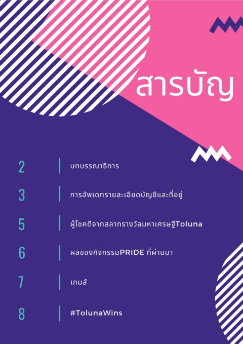 สารบัญ 2 บทบรรณาธิการ 3 การอัพเดทรายละเอียดบัญชีและที อยู่ 5 ผู้โชคดีจากสลากรางวัลมหาเศรษฐี T o l u n a 6 ผลของกิจกรรม P R I D E ที ผ่านมา 7 เกมส์ 8 # T o l u n a W i n s