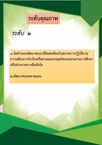 ระดับคุณภาพ ระดับ ๒ 1.จัดท ำแผนพัฒนำตนเองที่สอดคล้องกับสภำพกำรปฏิบัติงำน ควำมต้องกำรจ ำเป็นหรือตำมแผนกลยุทธ์ของหน่วยงำนกำรศึกษำ หรือส่วนรำชกำรต้นสังกัด 2.พัฒนำตนเองตำมแผน