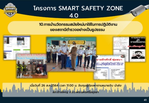 โครงการ SMART SAFETY ZONE 4.0 10.การน านวัตกรรมสมัยใหม่มาใช้ในการปฏิบัติงาน ของสถานีต ารวจอย่างเป็นรูปธรรม ่ ี ื เม่อวนท่ 26 ส.ค.2564 เวลา 11.00 น. จับกุมผู้ต้องหาตามหมายจับ น าสง ั สภ.ช้างใหญ่ ภ.จว.พระนครศรีอยุธยา 41