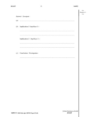 SULIT 15 1449/2 For Use Answer / Jawapan : (a) (b) Implication 1/ Implikasi 1 : Implication 2 / Implikasi 2 : (c) Conclusion / Kesimpulan : [Lihat halaman sebelah 1449/2 © 2020 Hak cipta MPSM Negeri Perlis SULIT