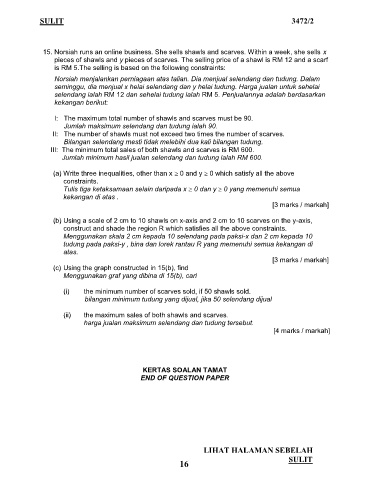 15. Norsiah runs an online business. She sells shawls and scarves. Within a week, she sells x