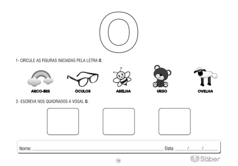 O O O 1- CIRCULE AS FIGURAS INICIADAS PELA LETRA O. ARCO-ÍRIS ÓCULOS ABELHA URSO OVELHA 2- ESCREVA NOS QUADRADOS A VOGAL O. 19