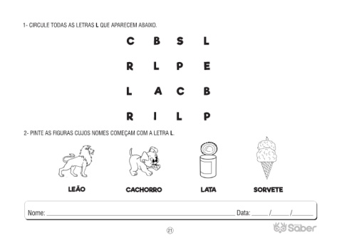1- CIRCULE TODAS AS LETRAS L QUE APARECEM ABAIXO. C B S L R L P E L A C B R I L P 2- PINTE AS FIGURAS CUJOS NOMES COMEÇAM COM A LETRA L. LEÃO CACHORRO LATA SORVETE 21