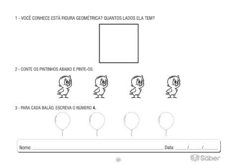 1 - VOCÊ CONHECE ESTÁ FIGURA GEOMÉTRICA? QUANTOS LADOS ELA TEM? 2 - CONTE OS PINTINHOS ABAIXO E PINTE-OS. 3 - PARA CADA BALÃO, ESCREVA O NÚMERO 4. 24