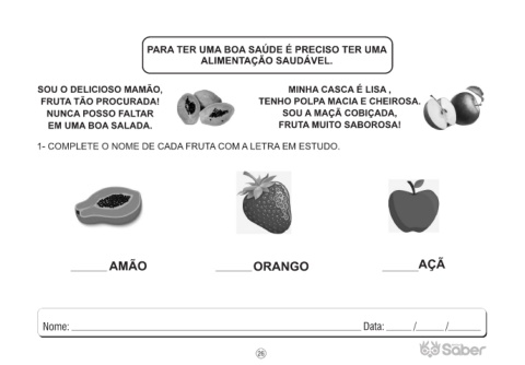 1- COMPLETE O NOME DE CADA FRUTA COM A LETRA EM ESTUDO.