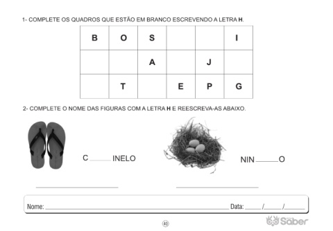 1- COMPLETE OS QUADROS QUE ESTÃO EM BRANCO ESCREVENDO A LETRA H. B O S I A J T E P G 2- COMPLETE O NOME DAS FIGURAS COM A LETRA H E REESCREVA-AS ABAIXO. C INELO NIN O 40
