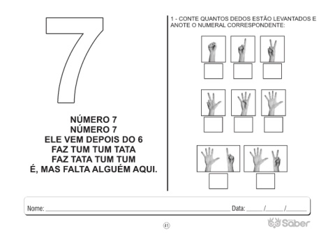 7 7 7 1 - CONTE QUANTOS DEDOS ESTÃO LEVANTADOS E ANOTE O NUMERAL CORRESPONDENTE: NÚMERO 7 NÚMERO 7 ELE VEM DEPOIS DO 6 FAZ TUM TUM TATA FAZ TATA TUM TUM É, MAS FALTA ALGUÉM AQUI. 41