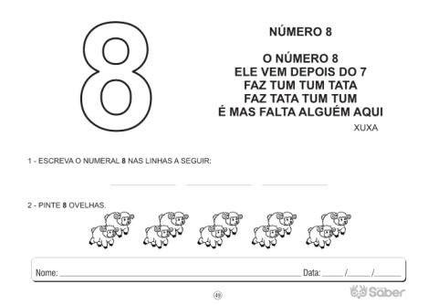 8 NÚMERO 8 O NÚMERO 8 ELE VEM DEPOIS DO 7 FAZ TUM TUM TATA FAZ TATA TUM TUM É MAS FALTA ALGUÉM AQUI XUXA 1 - ESCREVA O NUMERAL 8 NAS LINHAS A SEGUIR: 2 - PINTE 8 OVELHAS. 49