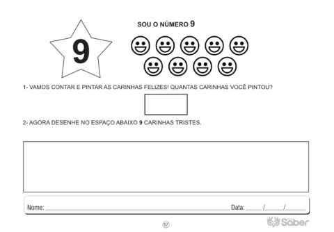 SOU O NÚMERO 9 9 1- VAMOS CONTAR E PINTAR AS CARINHAS FELIZES! QUANTAS CARINHAS VOCÊ PINTOU? 2- AGORA DESENHE NO ESPAÇO ABAIXO 9 CARINHAS TRISTES. 57