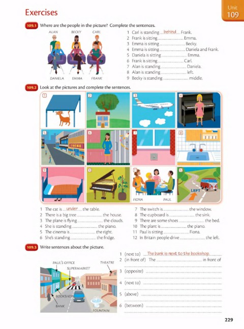 6 She's standing ...................................... the fridge. 12 In Britain people drive ...................................... the left.