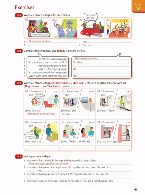 Write a sentence with just (They've just … I She's just … etc.) or a negative sentence with yet