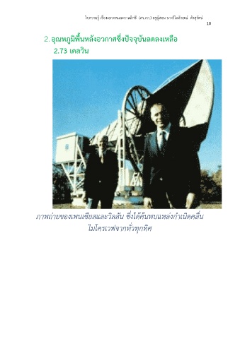 ใบความรู้ เรื่องเอกภพและกาแล็กซี (สว.ภก.) ครูผู้สอน นางวิไลลักษณ์ ตังสุรัตน ์ 10 2. อุณหภูมิพื้นหลังอวกาศซึ่งปัจจุบันลดลงเหลือ 2.73 เคลวิน ภาพถ่ายของเพนเซียสและวิลสัน ซึ่งได้ค้นพบแหล่งก าเนิดคลื่น ไมโครเวฟจากทั่วทุกทิศ