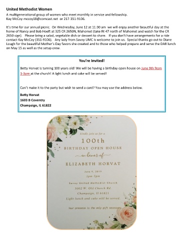 contact Kay McCoy (351-9106). Any lady from Savoy UMC is welcome to join us. Special thanks go out to Diane