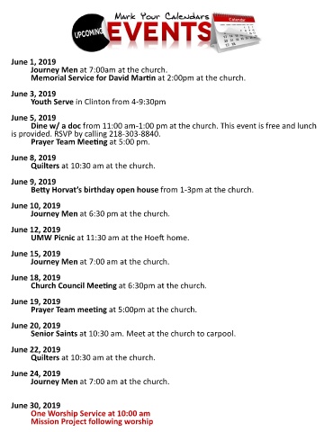 UMW Picnic at 11:30 am at the Hoeft home.