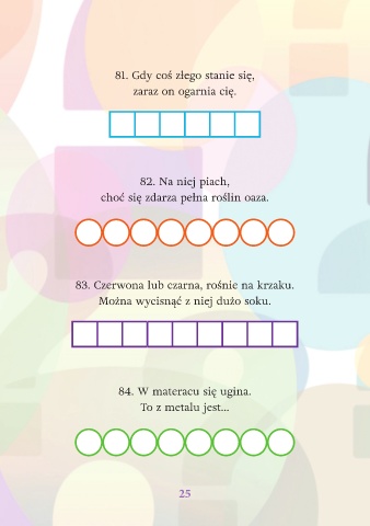 81. Gdy coś złego stanie się, zaraz on ogarnia cię. 82. Na niej piach, choć się zdarza pełna roślin oaza. 83. Czerwona lub czarna, rośnie na krzaku. Można wycisnąć z niej dużo soku. 84. W materacu się ugina. To z metalu jest... 25