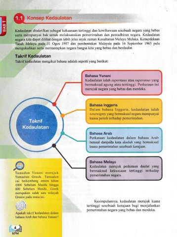 o Kedaulatan ditakrifkan sebagai kekuasaan tertinggi dan kewibawaan sesebuah negara yang bebas