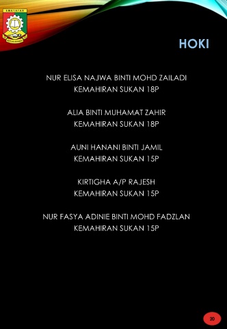 HOKI NUR ELISA NAJWA BINTI MOHD ZAILADI KEMAHIRAN SUKAN 18P ALIA BINTI MUHAMAT ZAHIR KEMAHIRAN SUKAN 18P AUNI HANANI BINTI JAMIL KEMAHIRAN SUKAN 15P KIRTIGHA A/P RAJESH KEMAHIRAN SUKAN 15P NUR FASYA ADINIE BINTI MOHD FADZLAN KEMAHIRAN SUKAN 15P