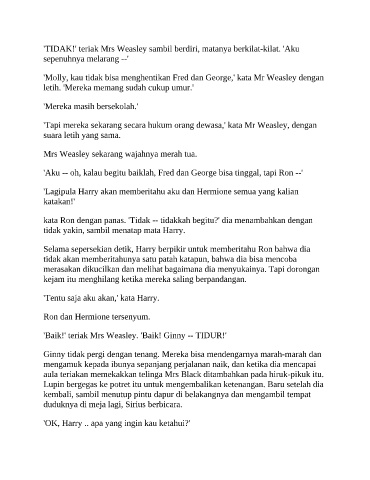 'TIDAK!' teriak Mrs Weasley sambil berdiri, matanya berkilat-kilat. 'Aku