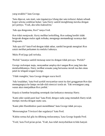 'Ada apa sih?' kata Fred dengan tidak sabar, sambil bergerak mengitari Ron