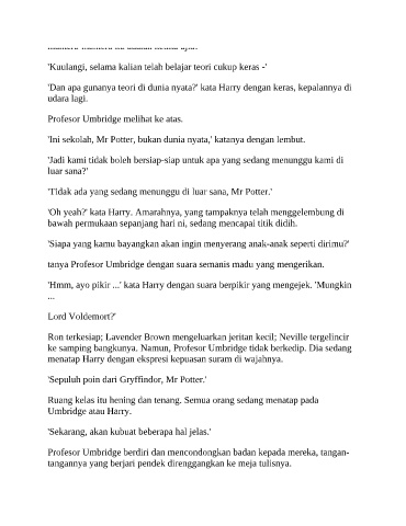 ke samping bangkunya. Namun, Profesor Umbridge tidak berkedip. Dia sedang