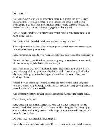 Harry berpaling dan melihat Angelina, Fred dan George semuanya terbang