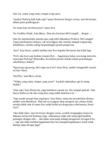 'Ke Grubbly-Plank,' kata Harry. 'Dan aku bertemu McGonagall ... dengar ...'