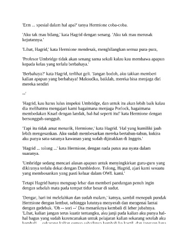 'Tapi itu tidak amat menarik, Hermione,' kata Hagrid. 'Hal yang kumiliki jauh