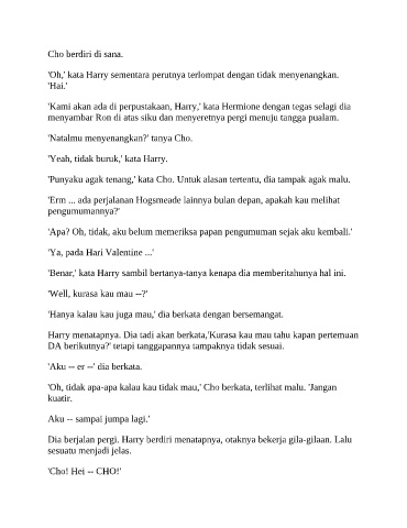 'Oh, tidak apa-apa kalau kau tidak mau,' Cho berkata, terlihat malu. 'Jangan