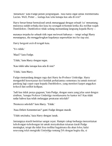 Fudge memandang dengan ragu dari Harry ke Profesor Umbridge. Harry