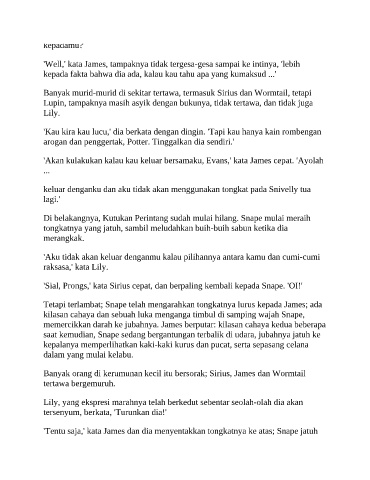 'Tentu saja,' kata James dan dia menyentakkan tongkatnya ke atas; Snape jatuh