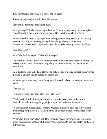 'Aku bertemu Cho tadi,' kata Hermione coba-coba. 'Dia juga tampak benar-benar