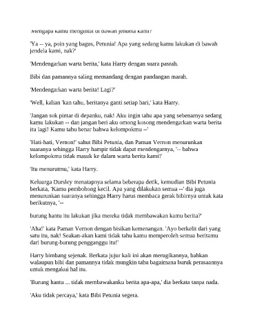 'Hati-hati, Vernon!' sahut Bibi Petunia, dan Paman Vernon menurunkan